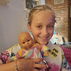 Blije Fabiënne met popje "Megan" dat nieuw stoffen lijfje kreeg.