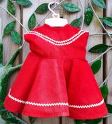 Jurkje met leuk, vlot cirkelrokje. Het effen rode jurkje is het originele, oude jurkje aan de hand waarvan het nieuwe patroon is gemaakt. Prijs patroon: € 4,00 excl. verzendkosten.